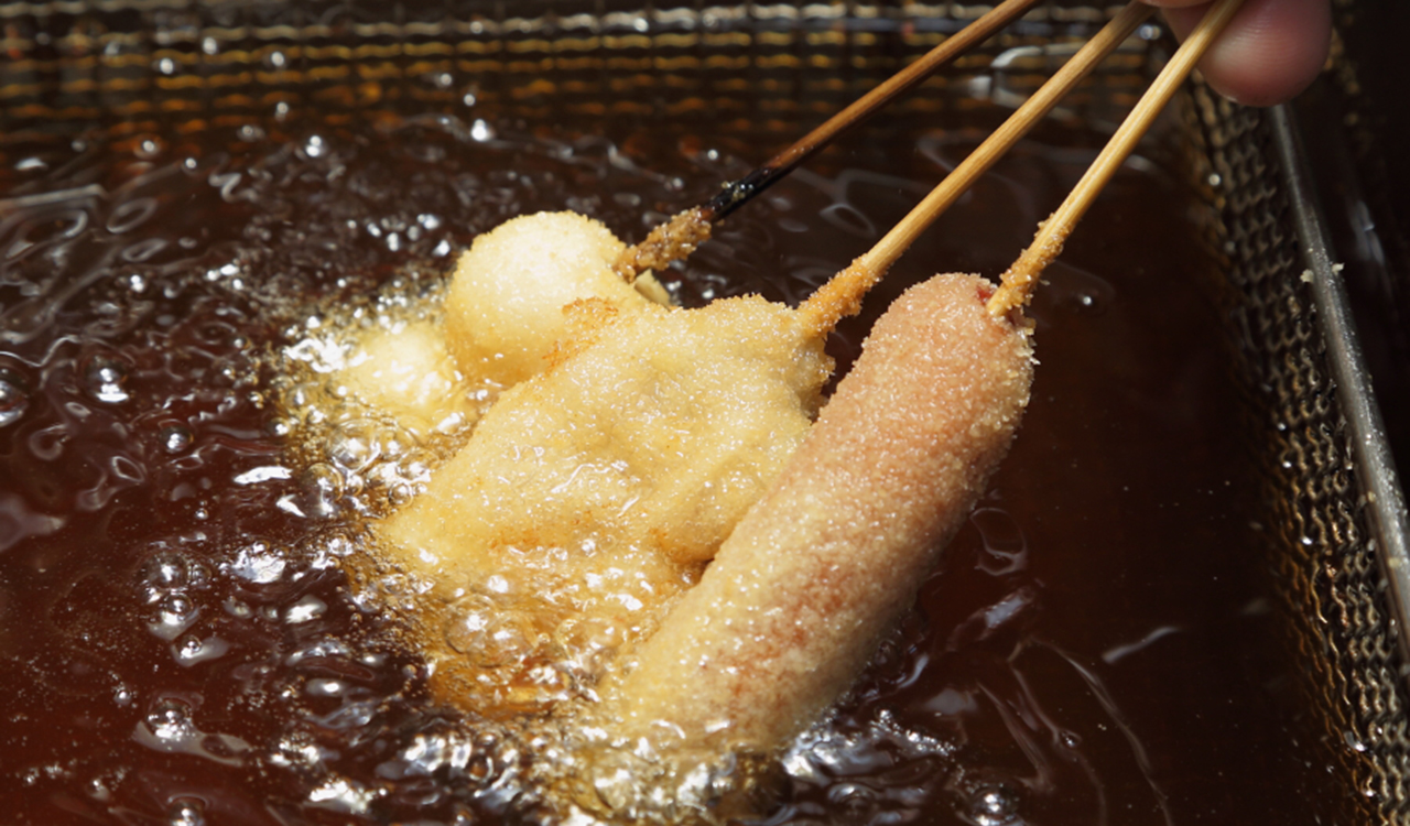 厳選したきめ細かいパン粉とオリジナルブレンドの油を使う串カツは、素材ごとに揚げる時間も変えているため、油切れが良く、あっさりとした仕上がりになっております。