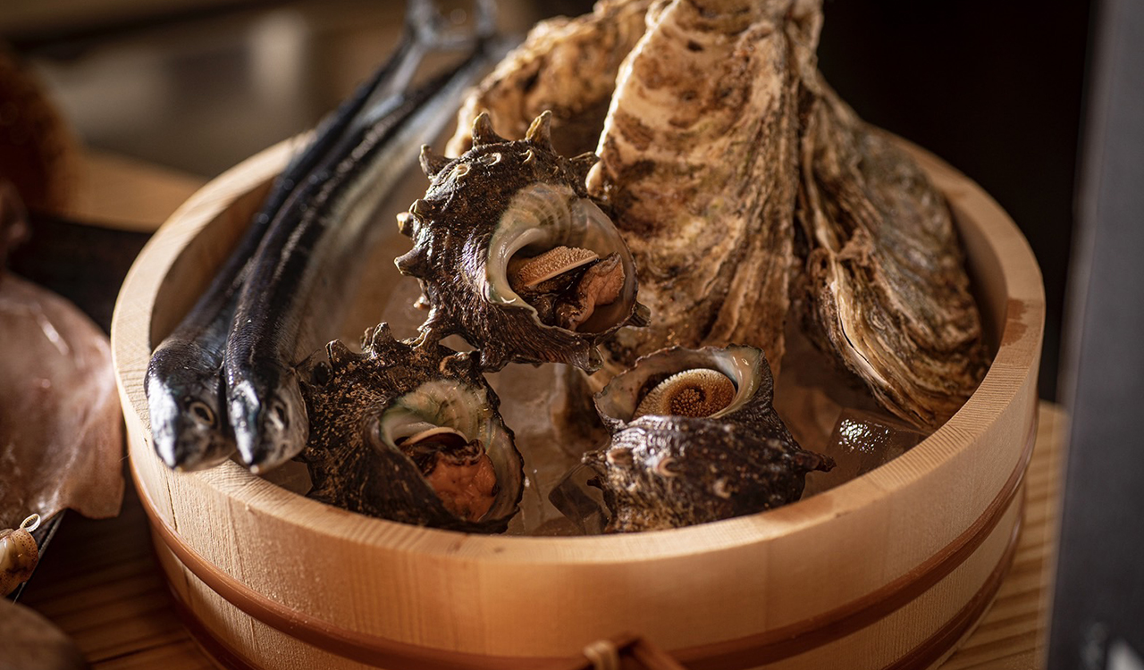 旬の素材を仕入れているので、日によって内容が変わるのも楽しい。1階のカウンター席では、目の前でライブ感あふれる調理を楽しんでいただけます。